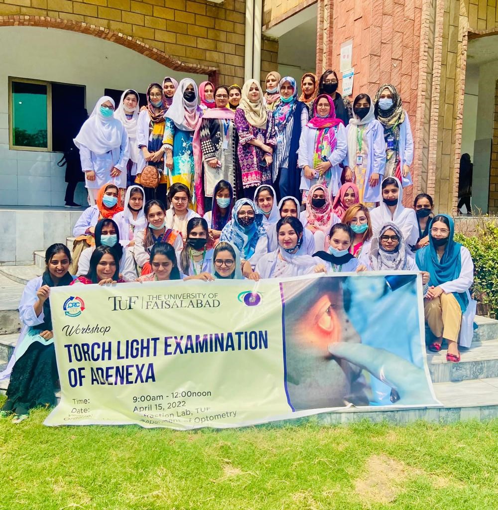 An Interactive workshop of “adnexa Assessment with Torch Light” was arranged by Dr.Ammara Affi for the students of Optometry 4th semester on 14th April 2022. Conducted by Dr Afrah Ayub Optometrist Amna Dispensary Faisalabad. It is important that all health care workers know how to examine the eyes. Use of a slit lamp microscope is a gold-standard method of examining the eye but a Basic Examination of the front of the eye can be carried out with a torch and this practice will increase confidence of the students.