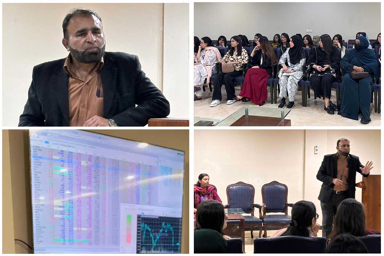 During the visit, PSX representatives delivered a very perceptive session on stock market fundamentals, trading mechanisms, market indices, and the significance of financial planning and investment strategies. Students also toured the trading floor, where they observed real-time market activities and learned about the roles of brokers and investors. The interactive session encouraged active participation, enabling students to engage with industry professionals and gain valuable exposure to real-world financial practices. The visit proved to be a highly enriching experience, strengthening students’ financial knowledge and equipping them with essential insights for future careers in finance and business.