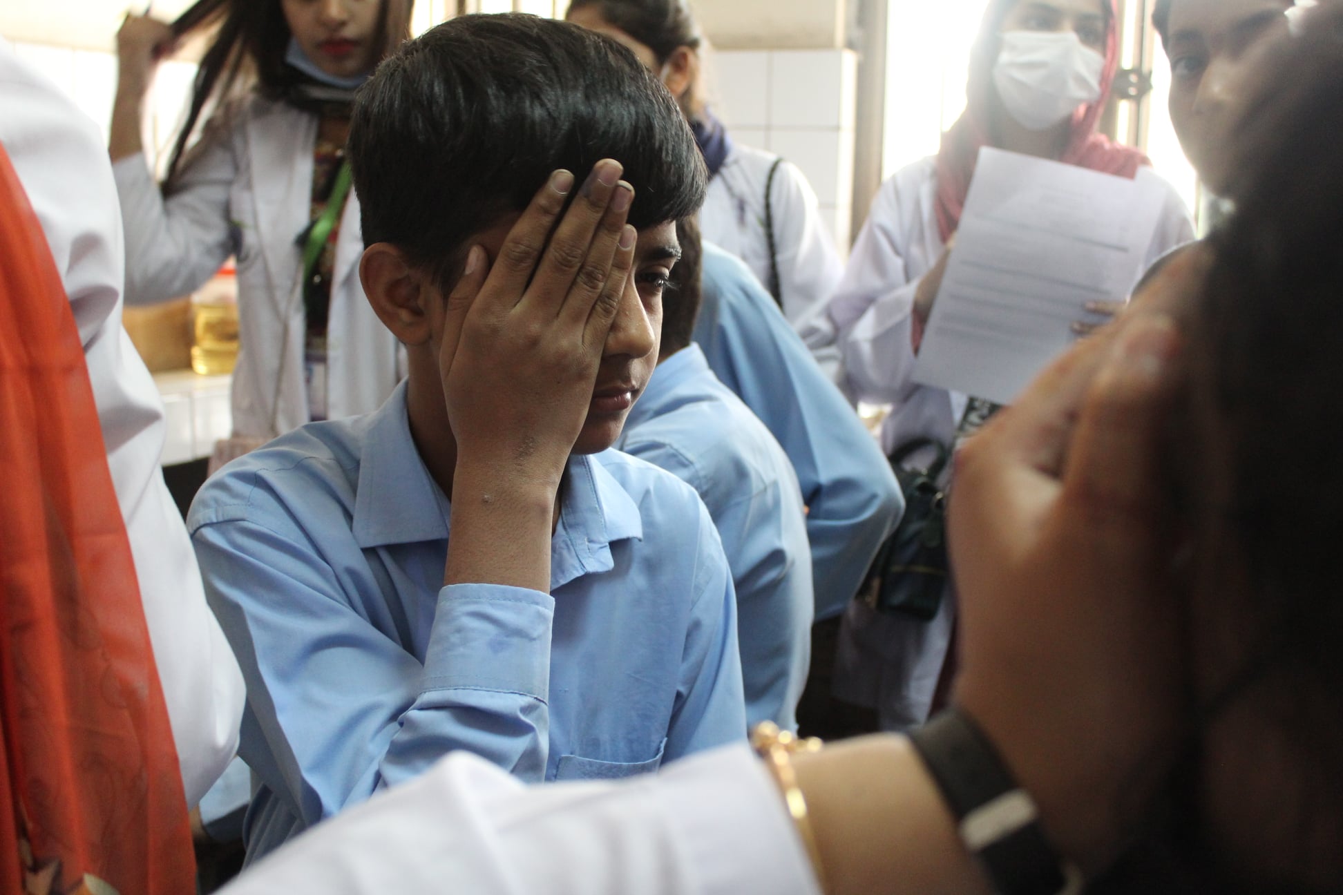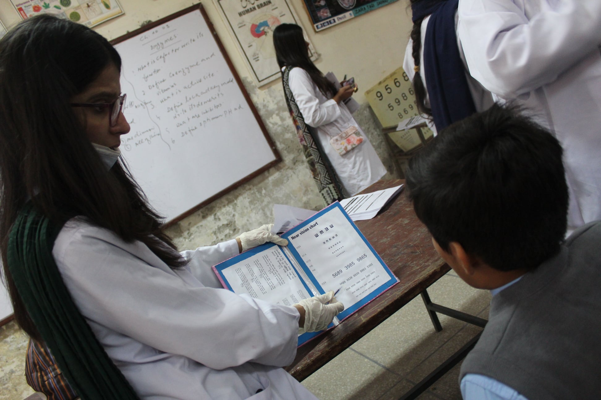 External and internal examination of the eye was performed using a pen torch and ophthalmoscope, while contrast and visual function by using Pelli Robson and Snellen chart. The screening activity was conducted under the supervision of Dr Nimra Gul and Dr Shakila Abbas.