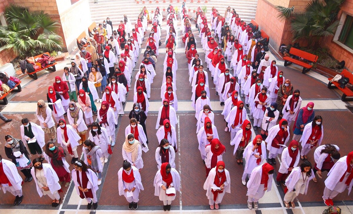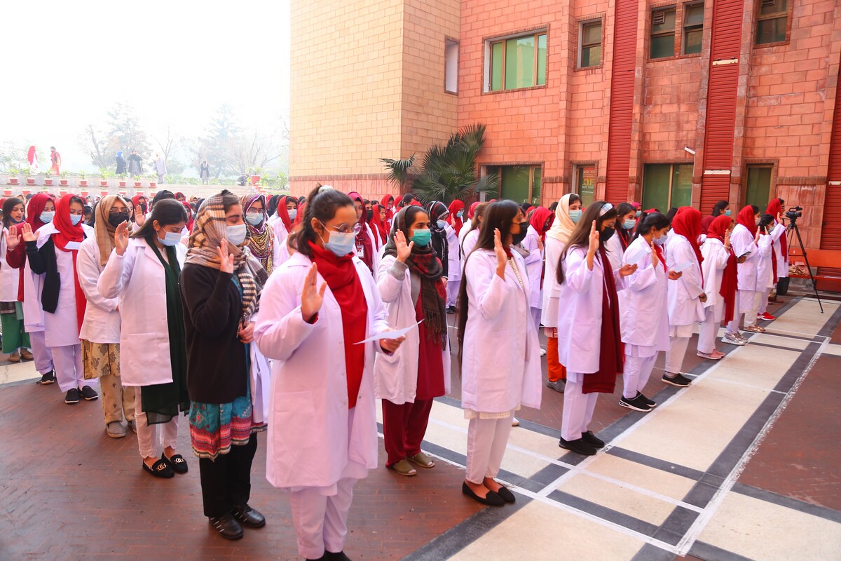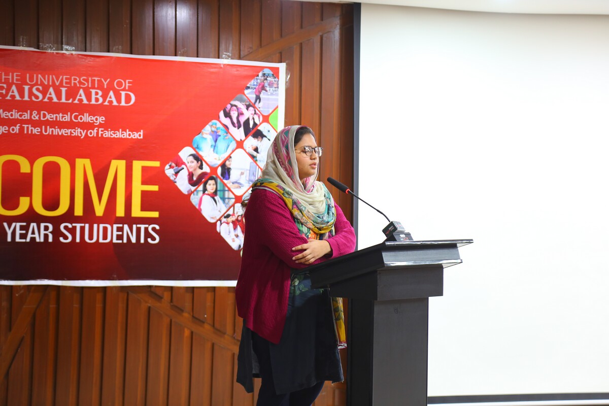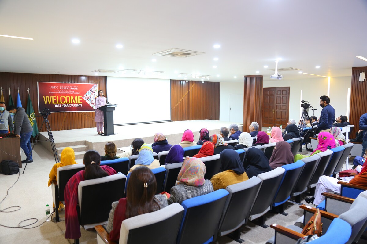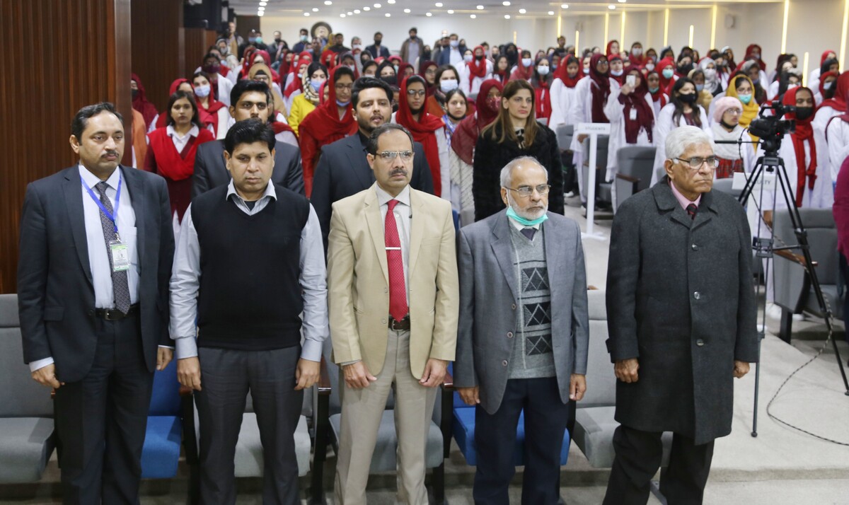 First-Year Students of MBBS and BDS get a warm welcome with White Coat ceremony at University Medical & Dental College on February 7, 2022. After donning their new white coats they recited the Oath pledging allegiance to the medical profession, their companions, seniors and their duty towards their patients.During the orientation program held in Ali Auditorium, Prof Dr Aamir Ali Choudhry, Principal UMDC in his address welcomed the new students. He said that we are proud of our highly qualified and experienced faculty and staff. He assured the fresh entrants that we at UMDC with highly qualified faculty and state-of-the-art infrastructure are doing our best to make their education adequate to modern healthcare achievements and give them the opportunity to become highly qualified and successful professionals. Prof Dr Mian Farrukh Imran, Principal Dental College, welcomed the first-year students and called upon them to render hard work for building a bright future. He briefed about the UMDC and affiliated Madinah Teaching Hospital. He urged the newcomers to take full advantage of these opportunities for becoming successful medical professionals and serve the society.