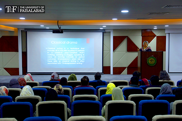 Seminar conducted by The Department of English Language and Literature on "Contemporary Drama" under the supervision of Dr. Qasim Shafiq (Asst. Prof./HoD English Department). The guest speaker was Prof. Dr. Shaheena Ayub Bhatti (Fatima Jinnah Women University, Islamabad). She highlighted the issues regarding Contemporary drama in today's scenario. She also responded to queries of Ph.D. scholars about the role of Classical Drama and Theatre in the present age.