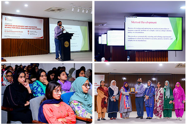During his address, Dr Shoaib elaborated on critical aspects of method development, including selection of mobile phases, column chemistry, system suitability parameters, and optimization strategies required to achieve accurate and reproducible results. He further discussed validation techniques used to ensure method reliability such as precision, accuracy, specificity, linearity, robustness, and sensitivity emphasizing their mandatory role in regulatory compliance and drug quality assurance.Dr Shoaib also shared practical case examples from drug testing laboratories, helping students connect theoretical knowledge with real-world applications in drug analysis, impurity profiling, and pharmaceutical product evaluation. His insights into how analytical methods contribute to modern drug design and development pipelines were particularly appreciated by the audience.